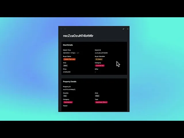 When our AI identifies a match, it appears instantly in your Deals section. Buyers see matched properties with AI-generated teasers showing key details (location area, category, price) but protecting confidential information like exact addresses. Sellers see when their property matches a qualified buyer without seeing buyer details until our team facilitates introductions.