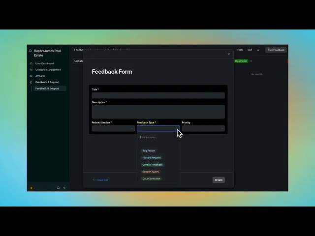The Feedback section connects you directly to our support team. Report bugs, request features, or get help with any platform questions.